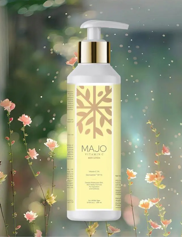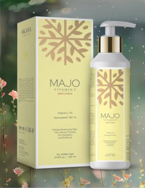 Majo: Vitamin c 3% + Dermawhite 1% Body Lotion is a revitalizing and fast-absorbing lotion formulated to nourish, hydrate, and brighten dull skin. It combines Vitamin C, known for its antioxidant and skin-brightening properties, and Derma white, a blend of natural active ingredients that help even out skin tone. this lotion works to restore radiance and clarity to your skin. Suitable for all skin types, it helps fade pigmentation, improve texture, and protect the skin from daily oxidative stress.